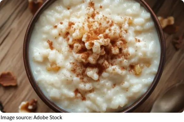 Rice pudding is made by slowly cooking rice in milk until it becomes thick and creamy. The rice absorbs the milk, and the mixture turns into a rich, silky dessert.